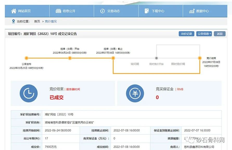 制砂生產線、排土場、礦山公路等配套設施土地租賃、征收等相關費用)。慈利縣鑫源石料有限公司最終以7900萬元成功競得該采礦權。