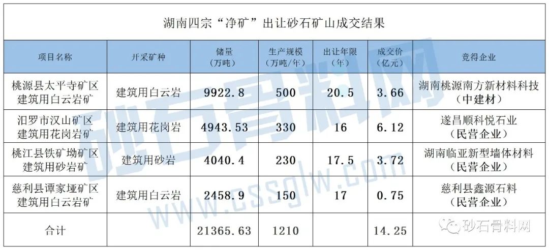 獲悉,湖南4宗“凈礦”出讓的建筑用石料礦成交,其中三宗采礦權由三家民營企業競得,一宗由中建材競得,累計成交金額超14億元,儲量超2億噸,年產1200萬噸,最高出讓年限20.5年。