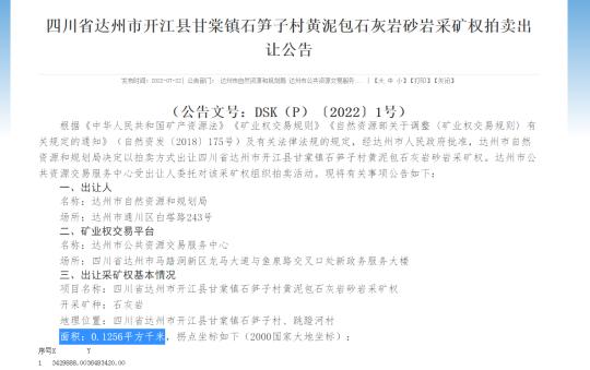 近日,達州市自然資源和規劃局中心發布四川省達州市開江縣甘棠鎮石筍子村黃泥包石灰巖砂巖采礦權拍賣出讓公告。資源儲量:礦區內保有資源量336.60萬立方米(885.1萬噸)。礦區面積:0.1256平方千米。