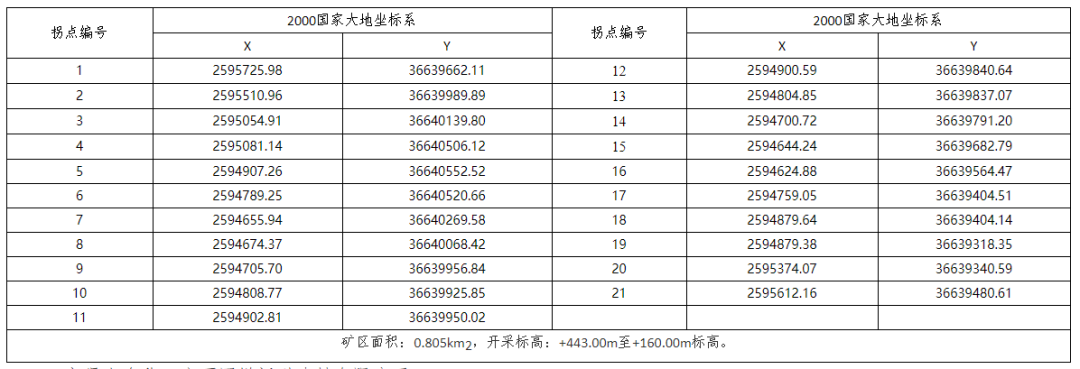 7.出讓年限:28.96年(含基建期1.90年),為新立礦山,該礦山已列入2020年度出讓計劃內8.礦區范圍由以下21個拐點坐標圈定,具體如下: