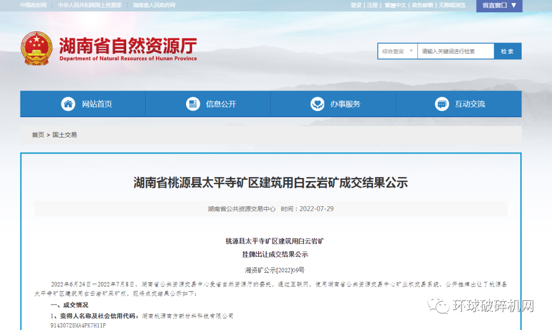 桃源縣太平寺礦區建筑用白云巖礦掛牌出讓成交結果公示
