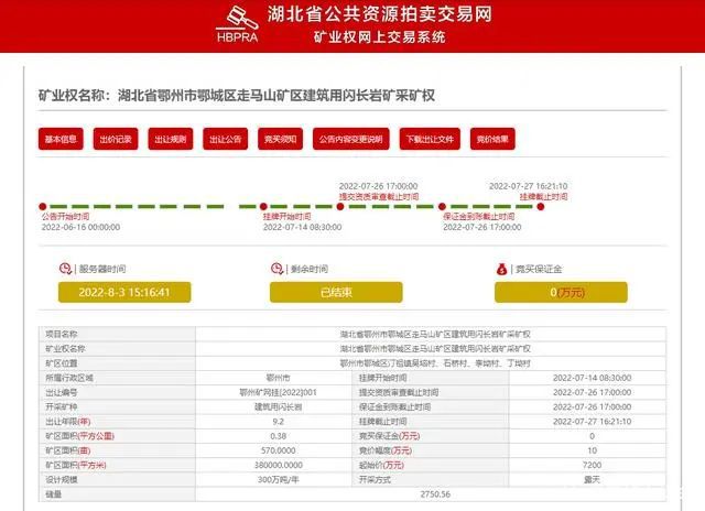 2、湖北省鄂州市鄂城區(qū)走馬山礦區(qū)建筑用閃長巖礦:資源量3353.6萬噸,生產規(guī)模300萬噸/年,成交價2.06億元。競得人—湖北江天建設集團有限公司。