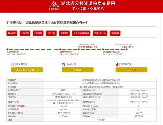 1、湖北省陽新縣仙牛山礦區(qū)建筑石料用白云巖礦采礦權:資源量10852.66萬噸,生產規(guī)模500萬噸/年,成交價2.2億元。競得人—湖北仙牛山綠色建筑材料有限公司。