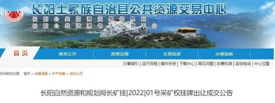 該礦區位于長陽縣龍舟坪鎮白氏坪村境內,開采礦種建筑石料用白云巖, 礦區范圍內占用的資源量46467.3萬噸(4.64億噸),可采資源量為29283.42萬噸(2.92億噸),出讓年限24.5年,起拍價為3.77億元,增值金額370萬元, 創下長陽土家族自治縣國有建設用地使用權和采礦權單筆成交價格新高。