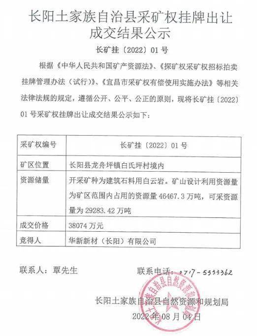 近日,湖北宜昌長陽土家族自治縣公共資源交易中心發布公示, 華新新材(長陽)有限公司以3.81億元競得資源儲量超4.6億噸建筑石料用白云巖礦采礦權。據了解, 華新新材(長陽)有限公司由華新水泥股份有限公司間接全資控股。