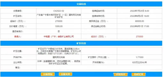 近日,中電建(廣寧)綠色礦業有限公司以27億競得廣東肇慶建筑用花崗巖礦采礦權。這是中電建2022年拍下的除海砂資源外的第6座礦山,也是中電建擁有的第12座礦山。以下是競拍信息: