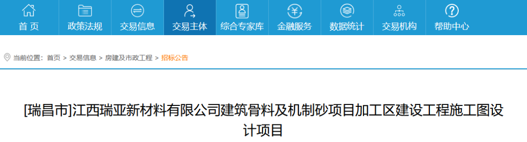 本招標項目江西瑞亞新材料有限公司建筑骨料及機制砂項目由瑞昌市發展和改革委員會(2101-360481-04-05-906192)批準建設,建設資金來源企業自籌,招標人(建設單位)為江西瑞亞新材料有限公司。項目已具備招標條件,現對該項目的加工區建設工程施工圖設計進行公開招標。