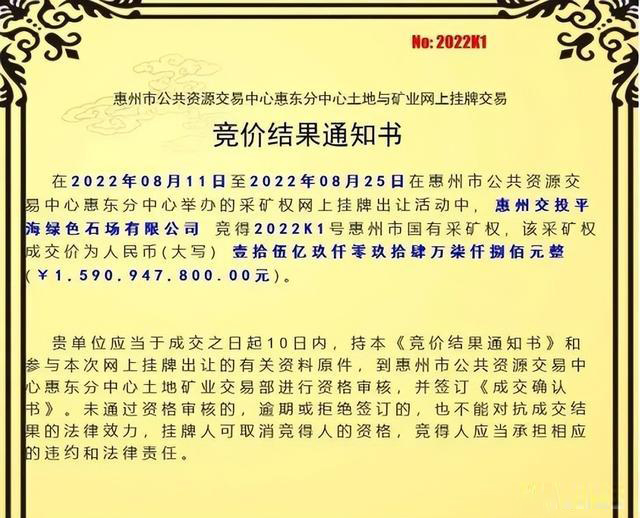2022年8月25日,惠州交投與惠東縣交通投資集團(tuán)有限公司合作成立的惠州交投平海綠色石場有限公司,以15.9億元成功競得惠東縣平海鎮(zhèn)寨頭礦區(qū)建筑用花崗巖礦采礦權(quán),該礦可采儲量10,642.55萬立方米,年開采規(guī)模達(dá)380萬立方米,出讓年限30年。