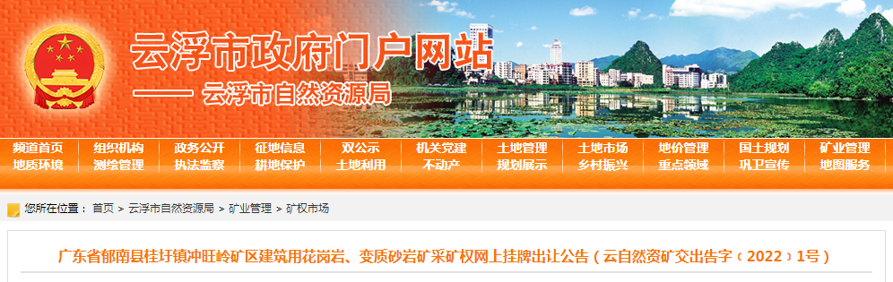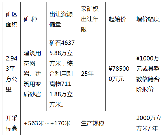 礦區建筑用花崗巖、變質砂巖礦采礦權進行掛牌公告,該采礦權可采資源儲量5.35億立方米,出讓25年,年生產規模2000萬立方米。