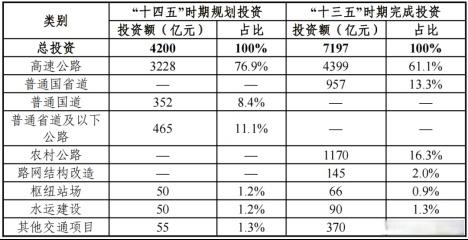 《規劃》明確,“十四五”時期,全省交通建設投資約為4200億元。其中,高速公路3228億元、普通國道352億元、普通省道及以下公路465億元、客貨運樞紐50億元、水運50億元、公路大中修及新型服務區等其他交通項目55億元。