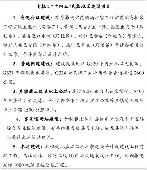 《規劃》明確,全力服務支撐民族地區高質量發展。傾斜支持民族地區的交通基礎設施建設,實行民族地區項目優先安排。規劃實施民族地區高速公路項目800公里(含儲備項目)、普通國道2600公里、鄉鎮通三級及以上公路1500公里。結合中央車購稅切塊規模,傾斜支持民族地區的農村公路危橋改造、安防建設。規劃建設從江縣侗鄉長途汽車客運站等縣級以上綜合客運樞紐和普通客運站,大力推進民族地區水運發展,補齊水運短板。