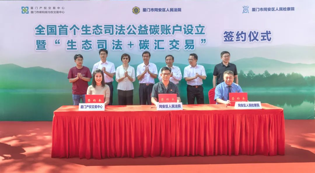 8月30日,全國首個生態(tài)司法公益碳賬戶設立暨“生態(tài)司法+碳匯交易”簽約儀式在廈門舉行。廈門市同安區(qū)人民法院、廈門市同安區(qū)人民檢察院與廈門產權交易中心(廈門市碳和排污權交易中心)開展合作,依托廈門產權交易中心設立的全國首個農業(yè)碳匯交易平臺和全國首個海洋碳匯交易平臺,打造生態(tài)司法和碳匯交易平臺之間的直通機制,建立“藍碳+綠碳”的“雙碳”生態(tài)司法修復模式。