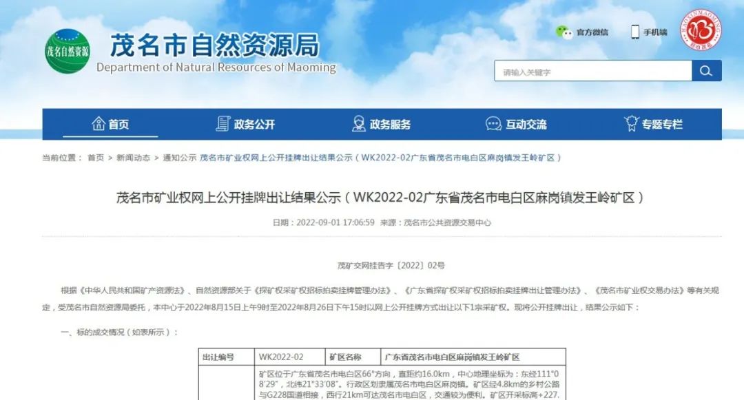 茂名市礦業(yè)權(quán)網(wǎng)上公開掛牌出讓結(jié)果公示