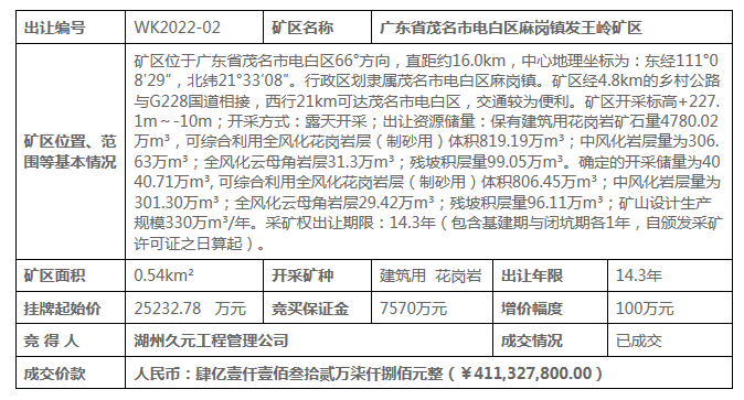 8月31日,廣東省茂名市電白區(qū)麻崗鎮(zhèn)發(fā)王嶺礦區(qū)采礦權(quán)成功出讓,擬出讓14.3年,掛牌起始價(jià)25232.78萬元,湖州久元工程管理公司以41132.78萬元競得,溢價(jià)率63.01%。