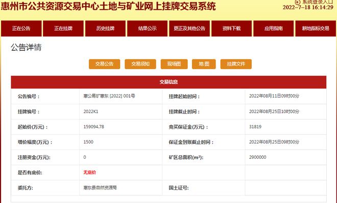 經過最終的掛牌競價環節,惠州交投旗下的惠州交投平海綠色石場有限公司以159094.78萬元的底價競得。據悉,該礦區開采年限為30年,將施行露天開采,年開采規模為380萬立方米。