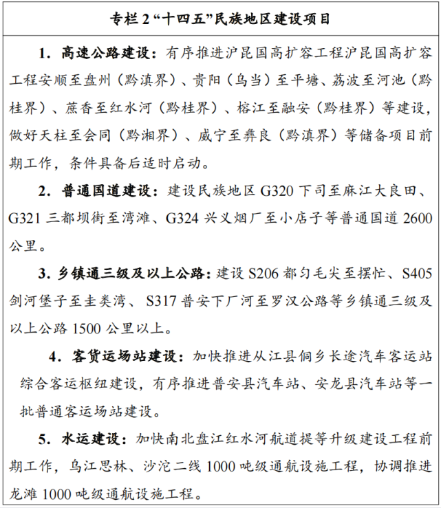 《規劃》明確,全力服務支撐民族地區高質量發展。傾斜支持民族地區的交通基礎設施建設,實行民族地區項目優先安排。規劃實施民族地區高速公路項目800公里(含儲備項目)、普通國道2600公里、鄉鎮通三級及以上公路1500公里。結合中央車購稅切塊規模,傾斜支持民族地區的農村公路危橋改造、安防建設。規劃建設從江縣侗鄉長途汽車客運站等縣級以上綜合客運樞紐和普通客運站,大力推進民族地區水運發展,補齊水運短板。