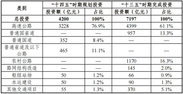 《規劃》明確,“十四五”時期,全省交通建設投資約為4200億元。其中,高速公路3228億元、普通國道352億元、普通省道及以下公路465億元、客貨運樞紐50億元、水運50億元、公路大中修及新型服務區等其他交通項目55億元。