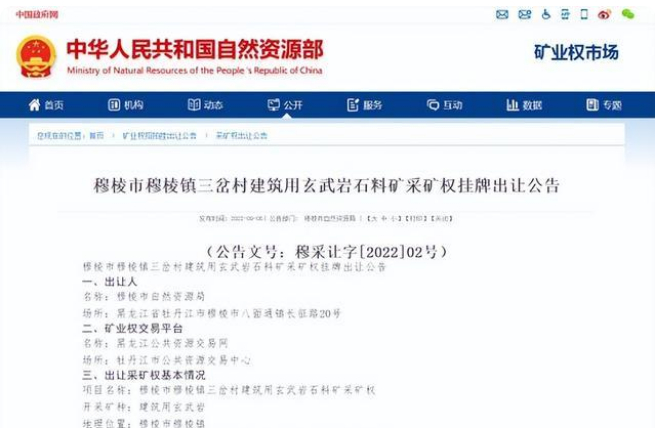 近日,穆棱市自然資源局中心發(fā)布穆棱市穆棱鎮(zhèn)三岔村建筑用玄武巖石料礦采礦權掛牌出讓公告。