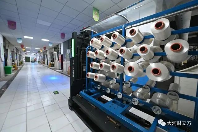 在新鄉白鷺投資集團“國內氨綸行業最先進的生產線”上,氨綸原液經過聚合反應之后,通過機器將氨綸纖維源源不斷地纏繞到“筒子”上,當每一個“筒子”上的氨綸重量達到500克時,生產線就自動將“筒子”傳送到AGV機器人運送車上,機器人將沿著設定的路線,將滿滿一車的氨綸成品運送至分揀處,再由機械臂將這些氨綸進行稱重、分裝,最終再通過機器人將打包好的氨綸運送至立體倉庫。