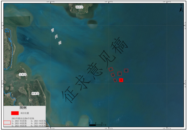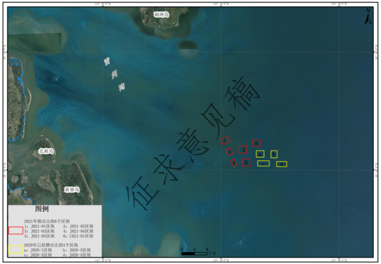 根據廣東省自然資源廳統一部署,2021年擬對湛江海域JH21-01、JH21-02、JH21-03、JH21-04、JH21-05和CB21-01共6個片區進行出讓。6個片區為1124.8m*1117.4m的矩形,擬出讓面積約125.6917公現,距JH21-01、JH21-02、JH21-03、JH21-04和 CB21-01五個片區的距離分別為3311.7m、1589.6m、934.4m、810.8m、2025.8m。