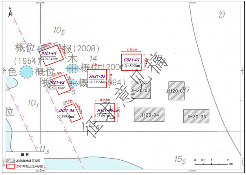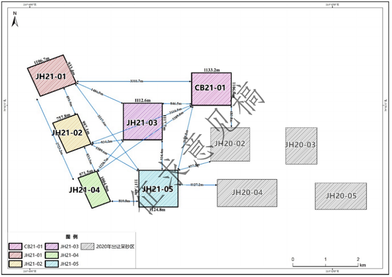 根據《廣東省海砂開采三年行動計劃(2020-2022年)》,2020湛江海域計劃開采5個片區,其中4個片區(JH20-02、JH20-03、JH20-04、JH20-05)位于本次擬開采的6個區塊東南側,最近距離680m。這4個區塊已于2021年5月取得招拍掛,目前已經啟動部分開采任務。