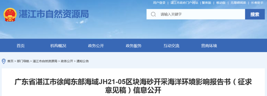 近日,廣東省湛江市自然資源局發布《廣東省湛江市徐聞東部海域JH21-05區塊海砂開采海洋環境影響報告書(征求意見稿)》(以下簡稱“報告書”),根據“報告書”內容:擬掛牌區海砂資源量856.16萬m?,設計采礦生產能力(原礦)為220萬m?/a。擬對粵港澳大灣區及廣東省國家戰略重大項目供砂。