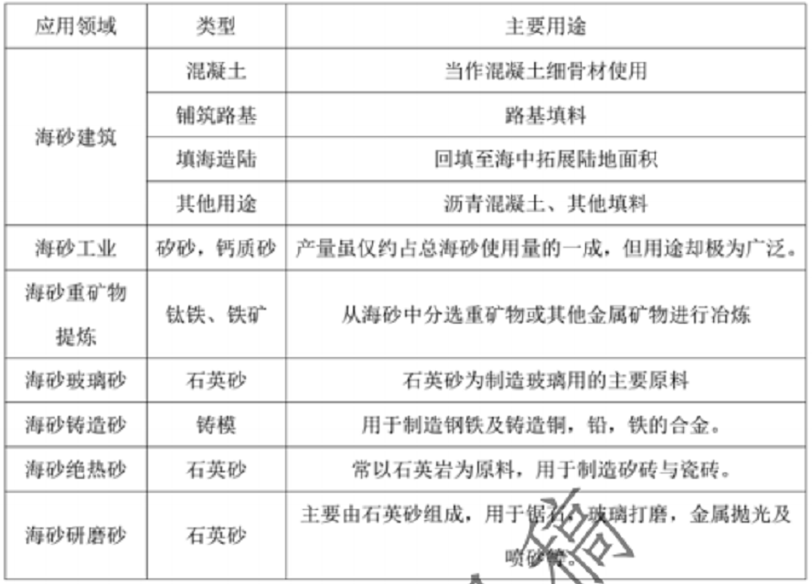 海砂在城市建設使用十分廣泛,海砂正成為僅次于石油、天然氣的第二大海洋礦產。根據用途不同海砂又可分為海砂建筑、海砂工業、海砂重礦物提煉等,其中海砂約有 45%用于當做混凝土細骨材料、20%用于鋪筑路基、20%用于填海造陸的填料,15%用于其他用途。