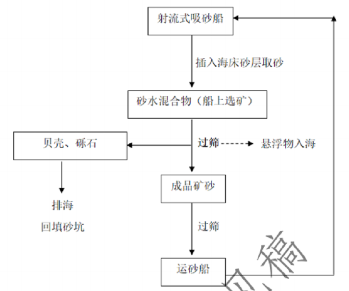 海砂射流開采工藝為:①射流泵將高壓射流合成砂漿吸入吸砂管;②吸砂管把砂漿吸到洗砂船艙上;③洗砂船洗砂分選;④成品砂。
