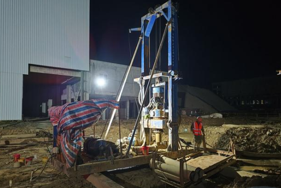 9月13日晚9點,在蘇山宏升新材料項目建設現場,燈火通明,機聲隆隆,工程車來往穿梭,一派熱鬧繁忙的施工景象;施工人員正在打樁、綁扎鋼筋、搭建腳手架。工程負責人介紹,整個施工現場分