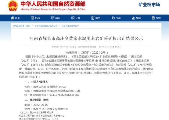 近日,新鄉(xiāng)國和礦業(yè)有限責(zé)任公司以91600萬元價競拍下年產(chǎn)1500萬噸河南輝縣高莊鄉(xiāng)黃家水泥用灰?guī)r礦。