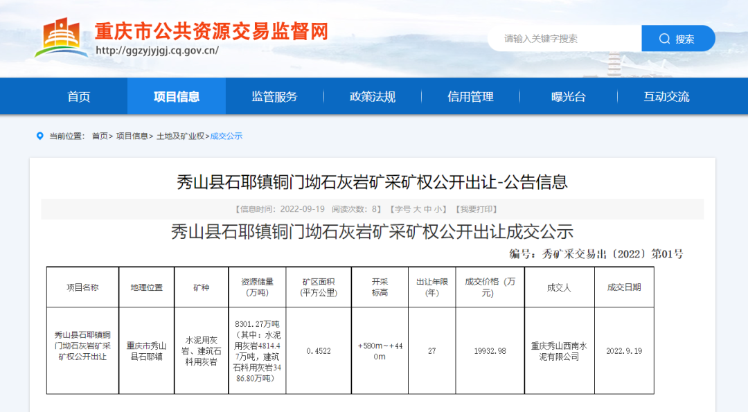 重慶市以網上公開掛牌交易方式成功出讓2宗采礦權。2宗礦權成交總價超4.5億,保有建筑砂石料儲量近9000萬噸,分別由陜煤集團控股的陜西生態水泥股份有限公司以及天山水泥子公司控股的重慶秀山西南水泥有限公司競得。