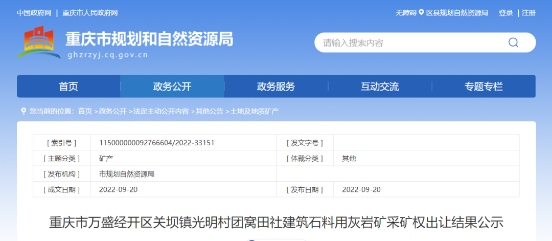 1、萬盛經開區關壩鎮光明村團窩田社建筑石料用灰巖礦:成交價:2.58億元;競得人名稱:陜西生態水泥股份有限公司;資源儲量:5169萬噸,生產規模300萬噸/年。