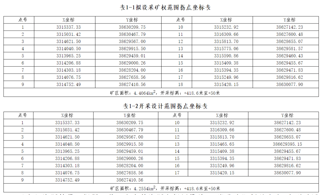 礦區范圍:根據《關于湖北省陽新縣袁廣-良畈礦區石灰巖礦采礦權劃定礦區范圍的批復》(黃自然資規批〔2022〕4號),擬設采礦權范圍面積4.4064平方公里(其中開采設計范圍面積4.2554平方公里),開采標高+418.6米至+50米,拐點坐標如下(大地2000坐標系):