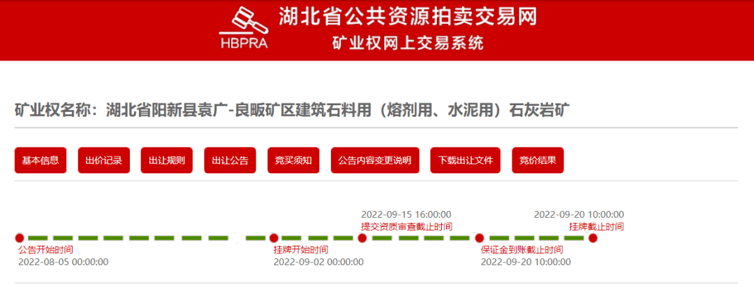 湖北省陽新縣袁廣-良畈礦區建筑石料用(熔劑用、水泥用)石灰巖礦,出讓期限:25年(自取得采礦許可證之日起計算,含基建期2年),生產規模:9500萬噸/年。