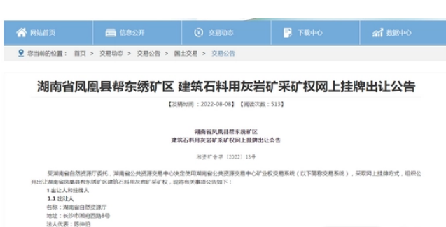 9月23日,根據省公共資源交易中心消息,湖南省鳳凰縣幫東繡礦區建筑石料用灰巖礦以2.47億元價格成功出讓,競得人為湖南省西部民爆股份有限公司,成為湘西首家砂石土采礦權“凈礦”出讓項目。