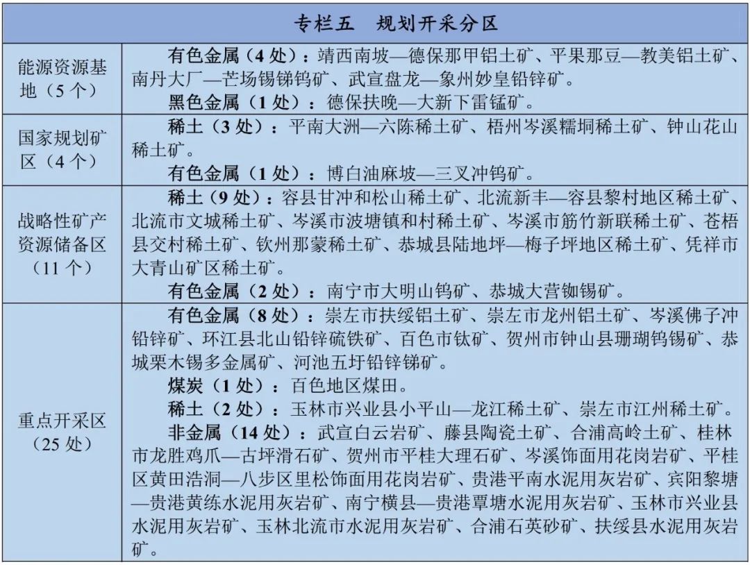 其中,規劃重點開采區25處,包括非金屬礦14處:武宣白云巖礦、藤縣陶瓷土礦、合浦高嶺土礦、桂林市龍勝雞爪—古坪滑石礦、賀州市平桂大理石礦、岑溪飾面用花崗巖礦、平桂區黃田浩洞—八步區里松飾面用花崗巖礦、貴港平南水泥用灰巖礦、賓陽黎塘—貴港黃練水泥用灰巖礦、南寧橫縣—貴港覃塘水泥用灰巖礦、玉林市興業縣水泥用灰巖礦、玉林北流市水泥用灰巖礦、合浦石英砂礦、扶綏縣水泥用灰巖礦。
