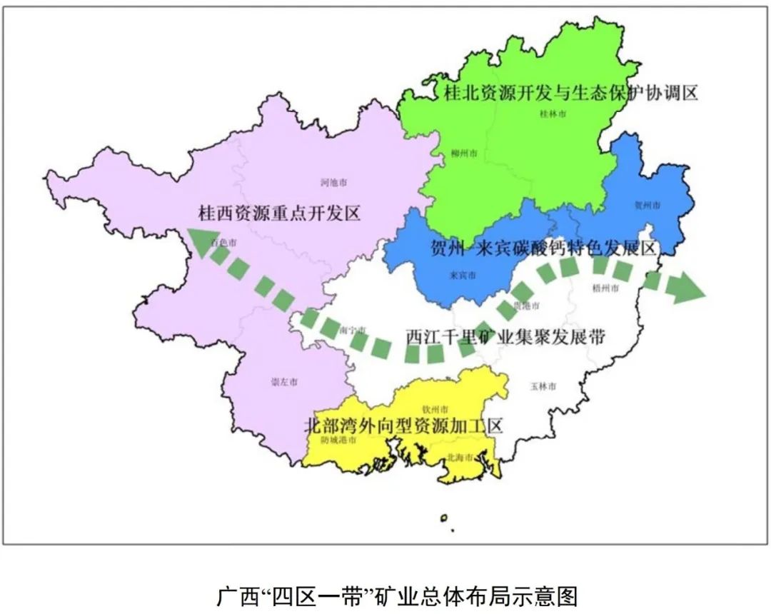 西江千里礦業集聚發展帶:充分發揮梧州、玉林、貴港、南寧等沿西江各市縣承東啟西和通往粵港澳優勢,綜合開發有色金屬、非金屬礦產。加快稀土、金、銀、鉛、鋅、重晶石、高嶺土、飾面用花崗巖等礦產開發利用。依托西江黃金水道,引導冶金、建材等資源型產業沿江集中布局發展,推動稀土、陶瓷土、飾面石材產業、新型建材產業集聚發展,沿西江合理布局若干大型砂石加工基地,把本區建設為全區重要的稀土、建材非金屬礦產開發加工基地,為珠江一西江經濟帶建設發展提供資源支撐。