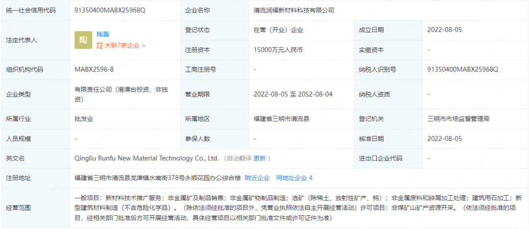 礦業有限公司于8月5日共同成立清流潤福新材料科技有限公司,其中華潤水泥占股90%。