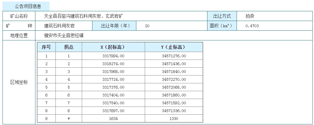 (二)本次拍賣出讓的詳細資料、具體要求和其他未盡事宜,詳見《天全縣百窯溝建筑石料用灰巖、玄武巖礦采礦權拍賣出讓文件》。