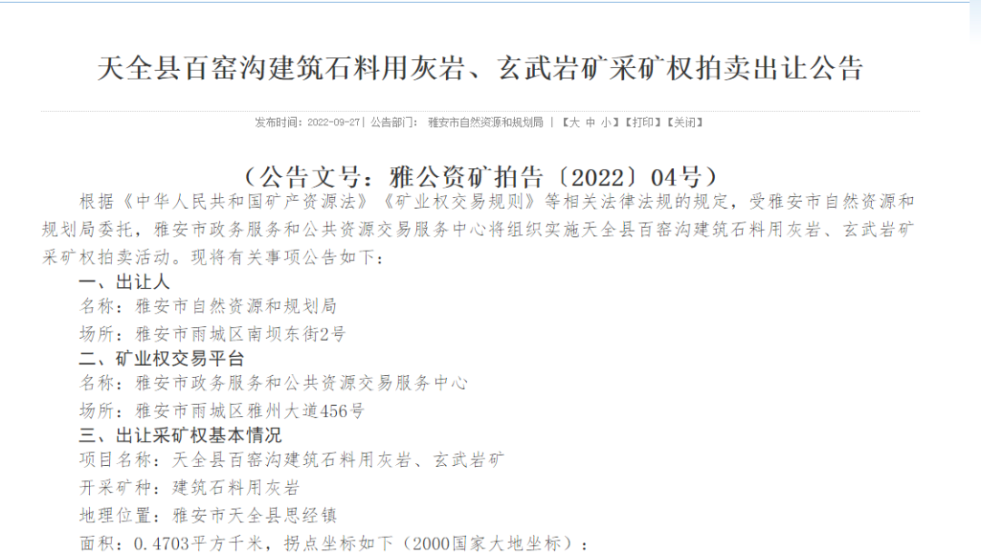 近期,雅安市自然資源和規劃局發布天全縣百窯溝建筑石料用灰巖、玄武巖礦采礦權出讓消息。
