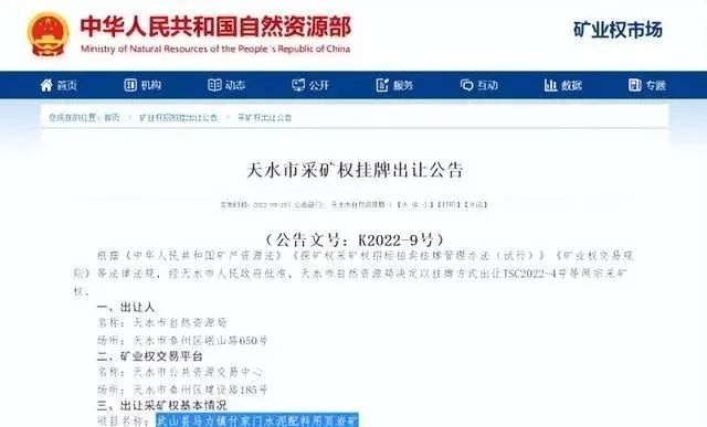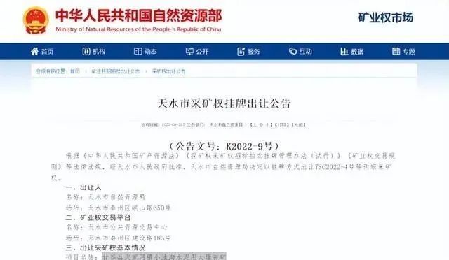 9月28日,天水市自然資源局掛牌出讓了兩宗礦山礦權,分別是甘谷縣武家河鎮小池溝水泥用大理巖礦采礦權和武山縣馬力鎮付家門水泥配料用頁巖礦采礦權。兩座礦權起拍價共1172.71萬元,資源總儲量共1303.01萬噸。