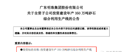 近日,廣東明珠集團發布公告,為滿足市場需求和擴大砂石產能,全資子公司廣東明珠礦業有限公司計劃投資5500萬元建設年產350萬噸砂石綜合利用生產線,對砂石經營進行擴產。
