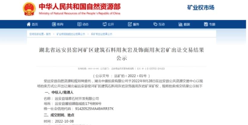 近日,遠安縣瑞泰石材開發有限公司以1350萬元競買下湖北省遠安縣窯河礦區建筑石料用灰巖及飾面用灰巖礦采礦權。