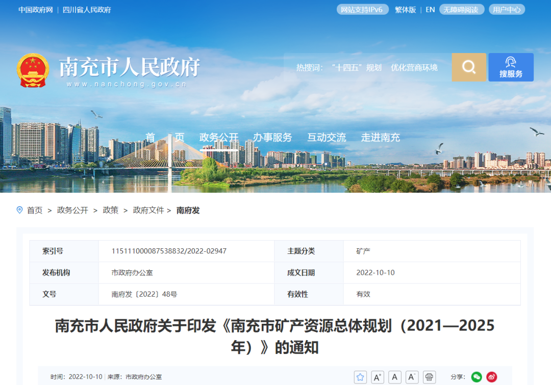 10月10日,四川南充印發《南充市礦產資源總體規劃(2021—2025年)》(以下簡稱《規劃》),梳理了南充市的礦產資源稟賦、勘探開發情況等,明確力爭到2025年,要基本形成礦產資源勘查開發與環境保護協調發展新格局,推動礦業高質量發展。