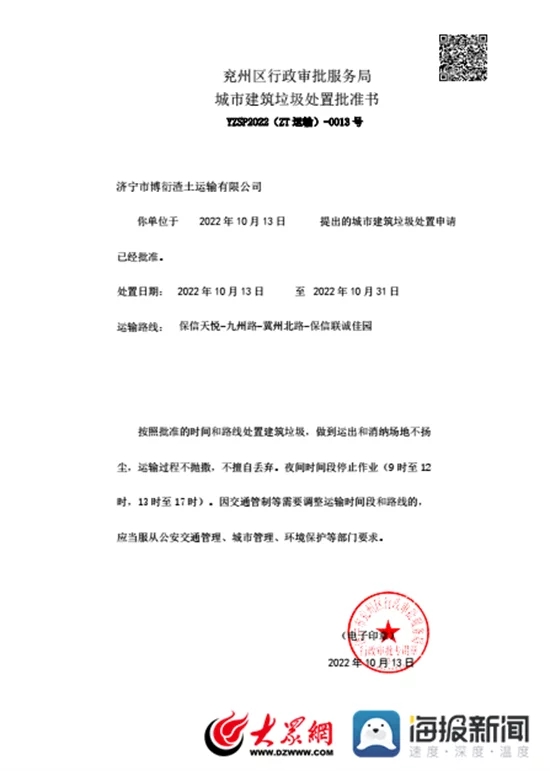 濟寧兗州區(qū)核發(fā)首張城市建筑垃圾處置批準(zhǔn)書電子證照