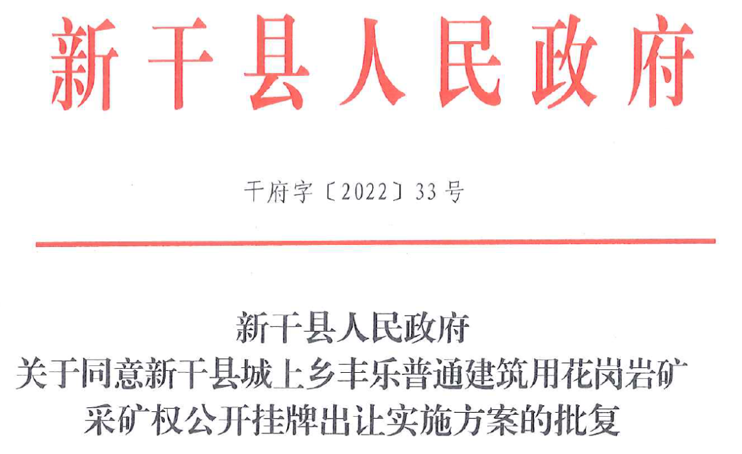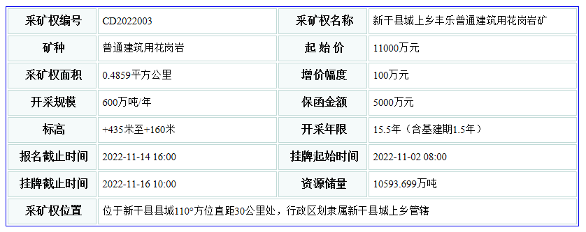 新干縣城上鄉豐樂普通建筑用花崗巖礦:開采規模600萬噸/年;開采年限15.5年(含基建期1.5年);資源儲量10593.699萬噸;起始價11000萬元。前期出讓成本共2600.7825萬元。