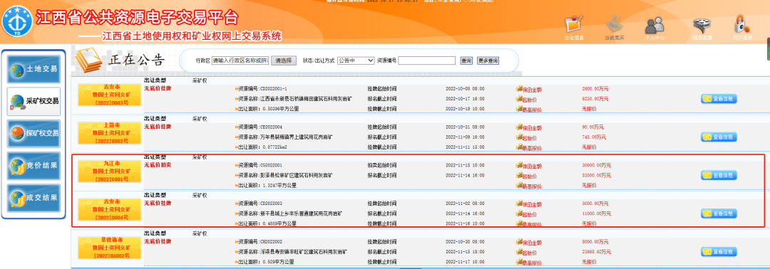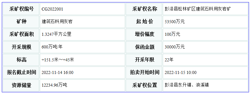 近日,江西省發布彭澤縣松林礦區建筑石料用灰巖礦及新干縣城上鄉豐樂普通建筑用花崗巖礦權2宗礦權。年產共1200萬噸,資源儲量近3億噸,起始價約6.5億。2宗礦權前期出讓成本近10億。