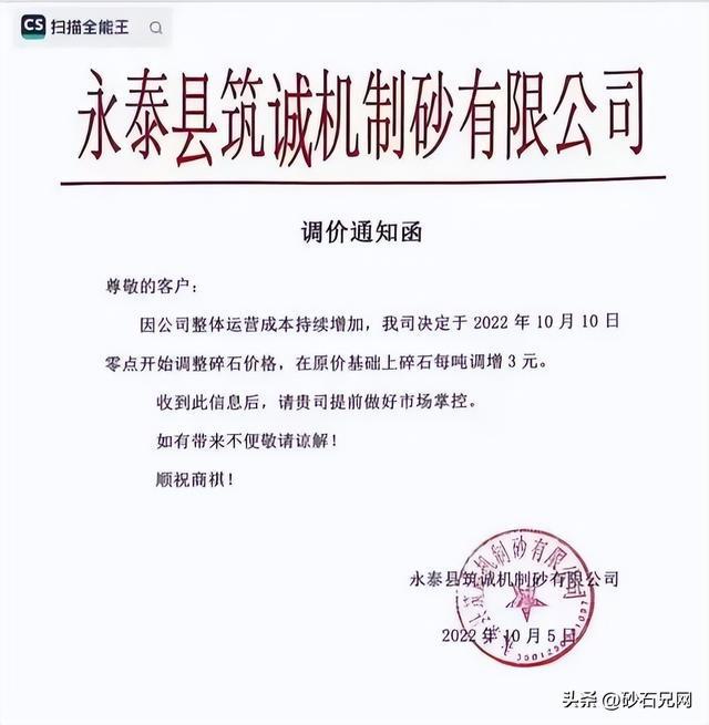 福建省福州市永泰縣筑誠機制砂有限公司表示,因公司整體運營成本持續增加,決定于2022年10月10日零點開始調整碎石價格,在原價基礎上碎石每噸調增3元。