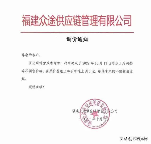 福建眾途供應鏈管理有限公司近日發布《調價通知》,決定于2022年10月13日零點開始調整碎石銷售價格,在原價基礎上碎石每噸上調3元。