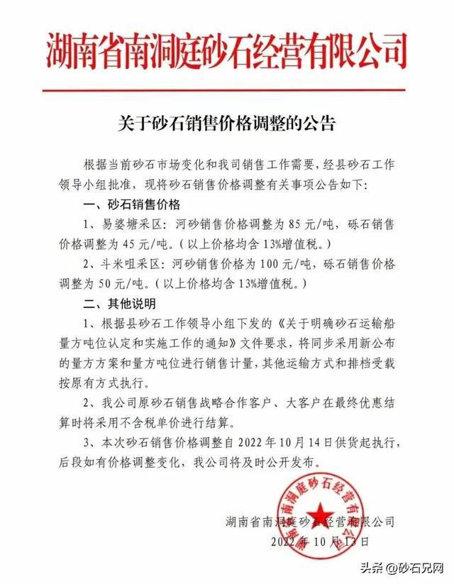 湖南省南洞庭砂石經營有限公司發布《關于砂石銷售價格調整的公告》,根據砂石市場變化和銷售工作需要,經縣砂石工作領導小組批準,砂石銷售價格進行調整: